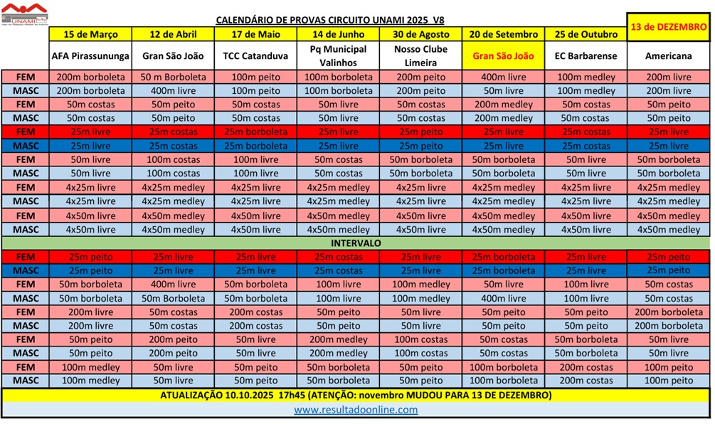 A data disponível para realização da Etapa de Americana do Circuito UNAMI 2025 é dia 13 de dezembro .